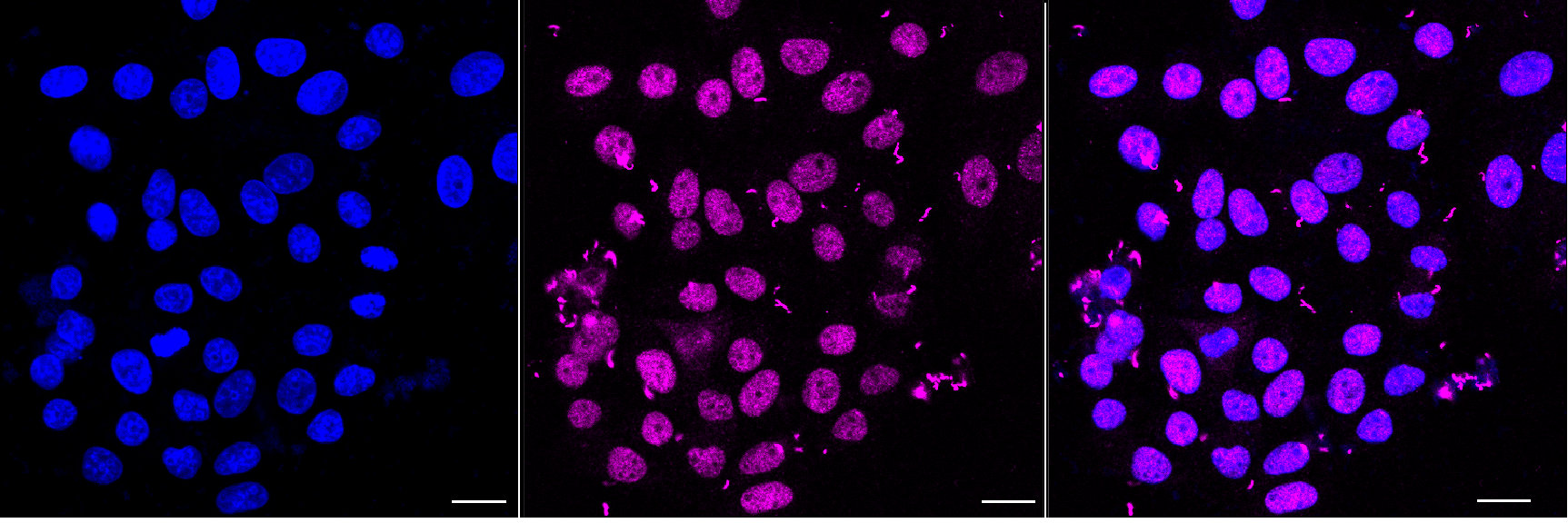 Immunocytochemical staining of HepG2 cells with EHMT2/G9A antibody. Nuclei were stained blue with DAPI; EHMT2/G9A was stained magenta with Alexa Fluor? 647. Images were taken using Leica stellaris 5. Protein abundance based on laser Intensity and smart gain: Medium. Scale bar, 20 μm.