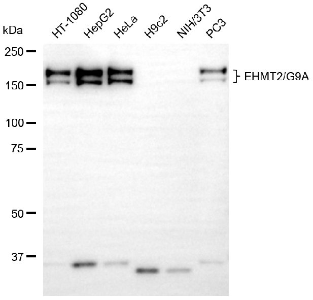 Western blotting analysis using EHMT2/G9A antibody. Total cell lysates (30 μg) from various cell lines were loaded and separated by SDS-PAGE. The blot was incubated with EHMT2/G9A antibody and HRP-conjugated goat anti-rabbit secondary antibody respectively.