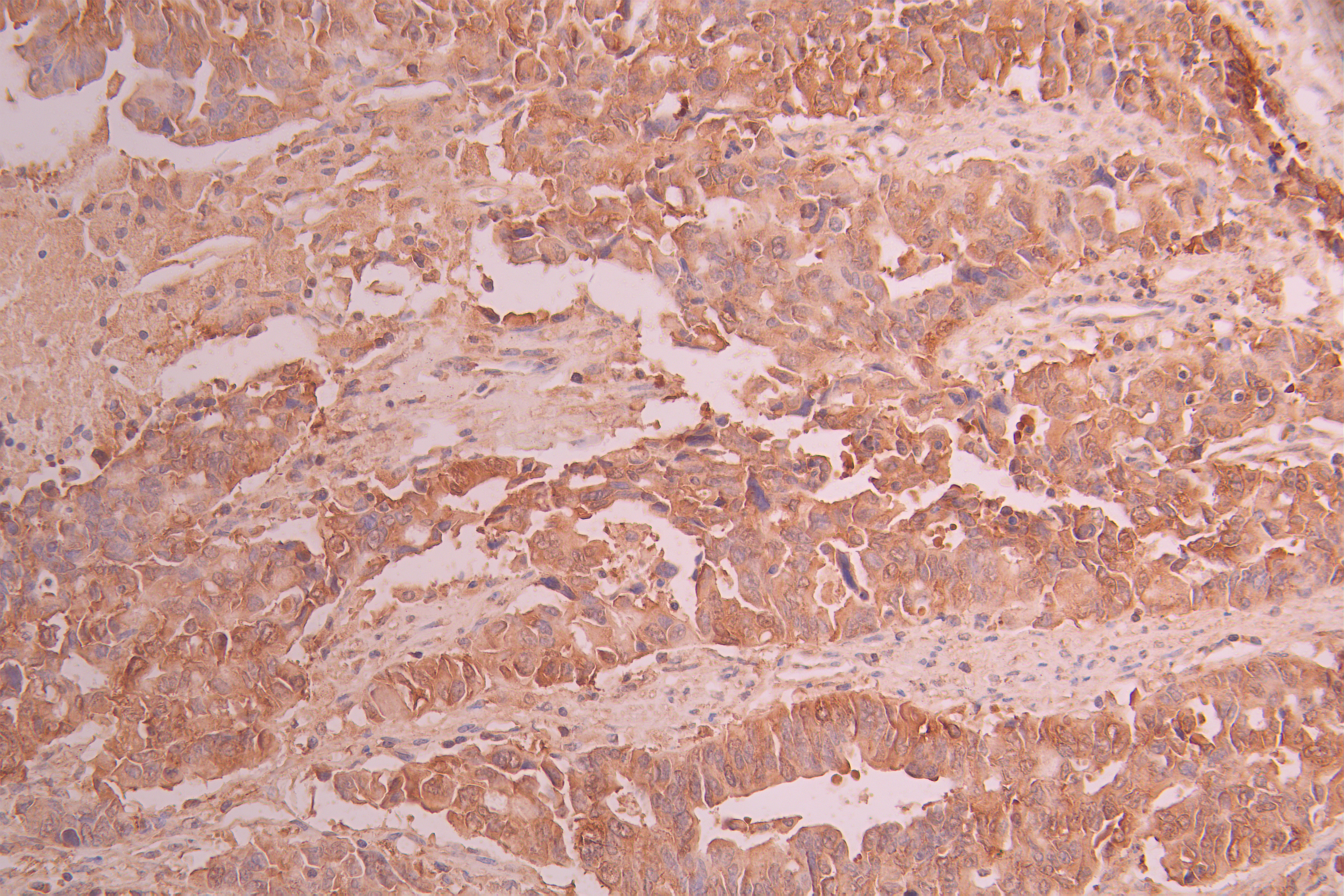 IHC image of CSB-RA547028A0HU diluted at 1:100 and staining in paraffin-embedded human endometrial cancer/endometrial carcinoma performed on a Leica BondTM system. After dewaxing and hydration, antigen retrieval was mediated by high pressure in a citrate buffer (pH 6.0). Section was blocked with 10% normal goat serum 30min at RT. Then primary antibody (1% BSA) was incubated at 4°C overnight. The primary is detected by a Goat anti-rabbit polymer IgG labeled by HRP and visualized using 0.05% DAB.