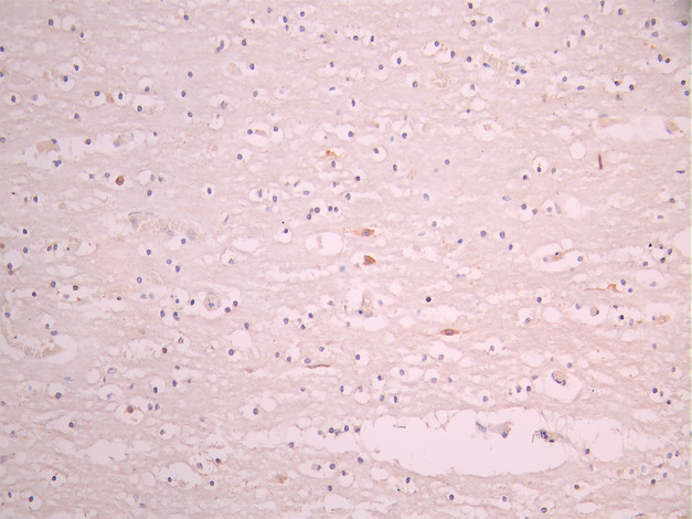 IHC image of CSB-RA185006A0HU diluted at 1:100 and staining in paraffin-embedded human brain tissue performed on a Leica BondTM system. After dewaxing and hydration, antigen retrieval was mediated by high pressure in a citrate buffer (pH 6.0). Section was blocked with 10% normal goat serum 30min at RT. Then primary antibody (1% BSA) was incubated at 4°C overnight. The primary is detected by a Goat anti-rabbit polymer IgG labeled by HRP and visualized using 0.05% DAB.