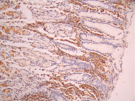 IHC image of CSB-RA185006A0HU diluted at 1:100 and staining in paraffin-embedded human stomach tissue performed on a Leica BondTM system. After dewaxing and hydration, antigen retrieval was mediated by high pressure in a citrate buffer (pH 6.0). Section was blocked with 10% normal goat serum 30min at RT. Then primary antibody (1% BSA) was incubated at 4°C overnight. The primary is detected by a Goat anti-rabbit polymer IgG labeled by HRP and visualized using 0.05% DAB.