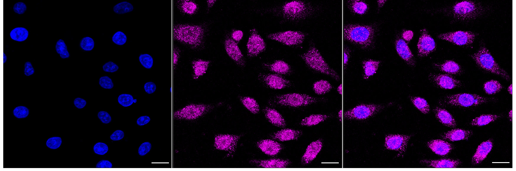 Immunocytochemical staining of HepG2 cells with Exocyst complex component 2 antibody. Nuclei were stained blue with DAPI; Exocyst complex component 2 was stained magenta with Alexa Fluor? 647. Images were taken using Leica stellaris 5. Protein abundance based on laser Intensity and smart gain: Medium. Scale bar, 20 μm.