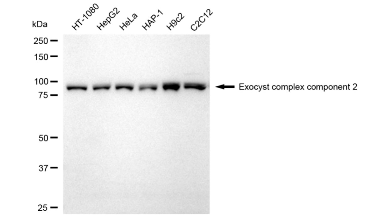 Western blotting analysis using Exocyst complex component 2 antibody. Total cell lysates (30 μg) from various cell lines were loaded and separated by SDS-PAGE. The blot was incubated with Exocyst complex component 2 antibody and HRP-conjugated goat anti-rabbit secondary antibody respectively.