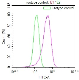 Overlay Peak curve showing HepG2 cells stained with CSB-RA155442A0HU (red line) at 1:100. The cells were fixed in 4% formaldehyde and permeated by 0.2% TritonX-100. Then 10% normal goat serum to block non-specific protein-protein interactions followed by the antibody (1ug/1*106cells) for 45min at 4℃. The secondary antibody used was FITC-conjugated Goat Anti-rabbit IgG(H+L) at 1:200 dilution for 35min at 4℃.Control antibody (green line) was rabbit IgG (1ug/1*106cells) used under the same conditions. Acquisition of >10,000 events was performed.