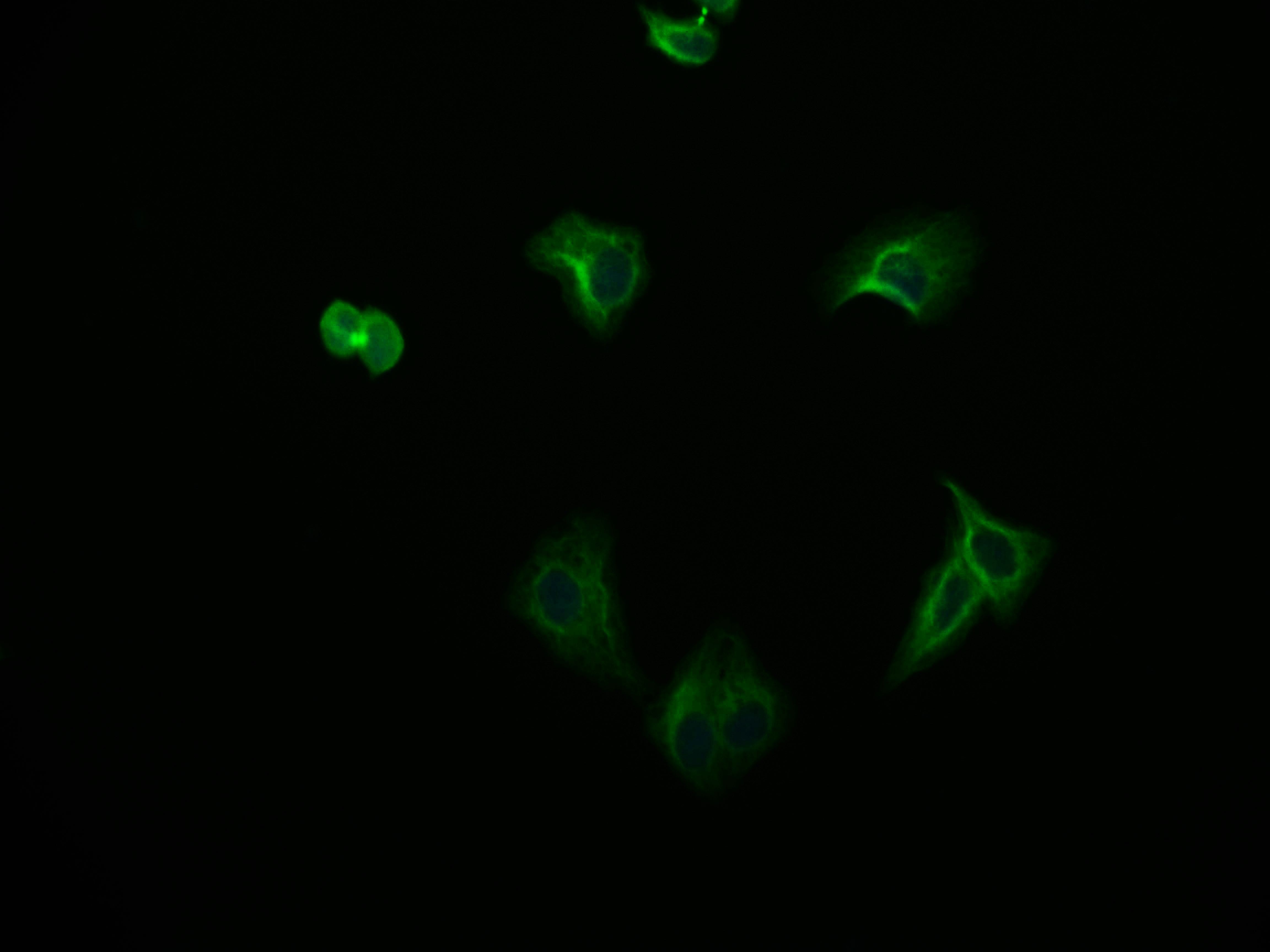 Immunofluorescence staining of HepG2 cell with CSB-RA155442A0HU at 1:50, counter-stained with DAPI. The cells were fixed in 4% formaldehyde and blocked in 10% normal Goat Serum. The cells were then incubated with the antibody overnight at 4°C. The secondary antibody was Alexa Fluor 565-congugated AffiniPure Goat Anti-Rabbit IgG(H+L).