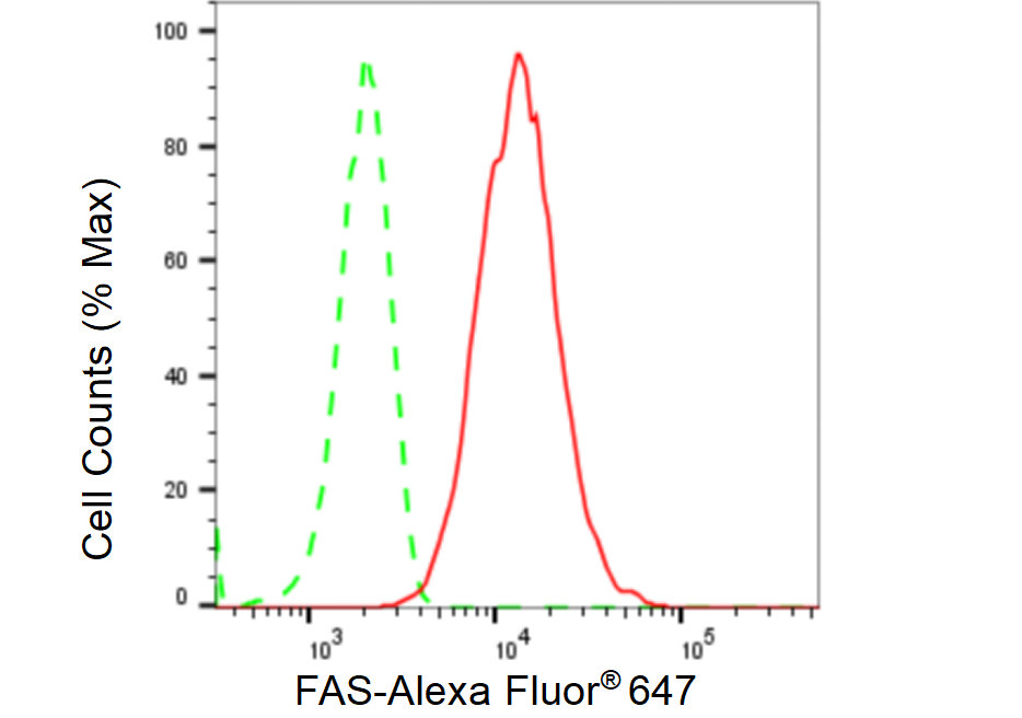 Flow cytometric analysis of FAS expression in HT-1080 cells using FAS antibody. Green, isotype control; red, FAS.