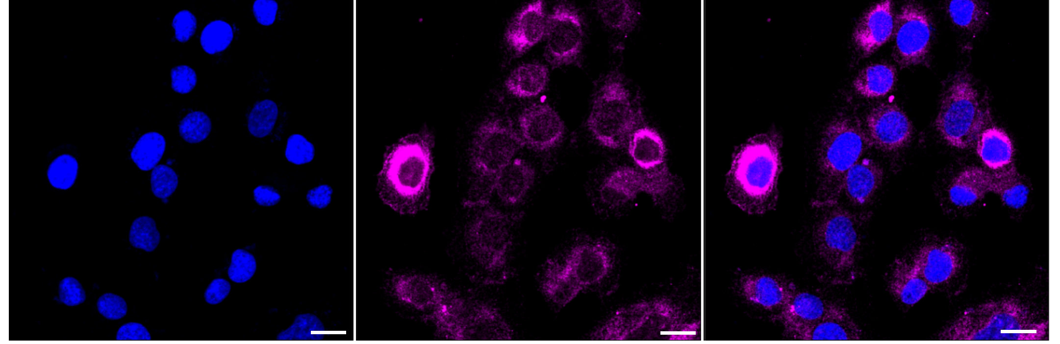 Immunocytochemical staining of HT-1080 cells with FAS antibody. Nuclei were stained blue with DAPI; FAS was stained magenta with Alexa Fluor? 647. Images were taken using Leica stellaris 5. Protein abundance based on laser Intensity and smart gain: Medium. Scale bar: 20 μm.