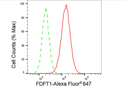 • Flow cytometric analysis of FDFT1 expression in HAP-1 cells using FDFT1 antibody. Green, isotype control; red, FDFT1.