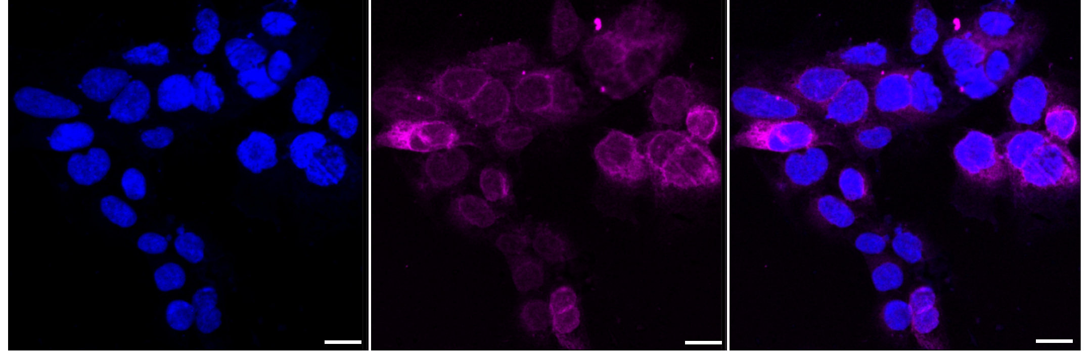 • Immunocytochemical staining of HAP-1 cells with FDFT1 antibody. Nuclei were stained blue with DAPI; FDFT1 was stained magenta with Alexa Fluor? 647. Images were taken using Leica stellaris 5. Protein abundance based on laser Intensity and smart gain: Medium. Scale bar: 20 μm.
