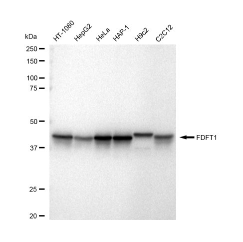 • Western blotting analysis using FDFT1 antibody. Total cell lysates (30 μg) from various cell lines were loaded and separated by SDS-PAGE. The blot was incubated with FDFT1 antibody and HRP-conjugated goat rabbit secondary antibody respectively.
