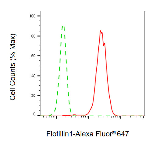 • Flow cytometric analysis of Flotillin1 expression in HepG2 cells using Flotillin1 antibody. Green, isotype control; red, Flotillin1.