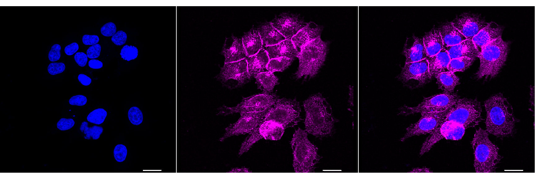 • Immunocytochemical staining of HepG2 cells with Flotillin 1 antibody. Nuclei were stained blue with DAPI; Flotillin 1 was stained magenta with Alexa Fluor? 647. Images were taken using Leica stellaris 5. Protein abundance based on laser Intensity and smart gain: Medium. Scale bar, 20 μm.