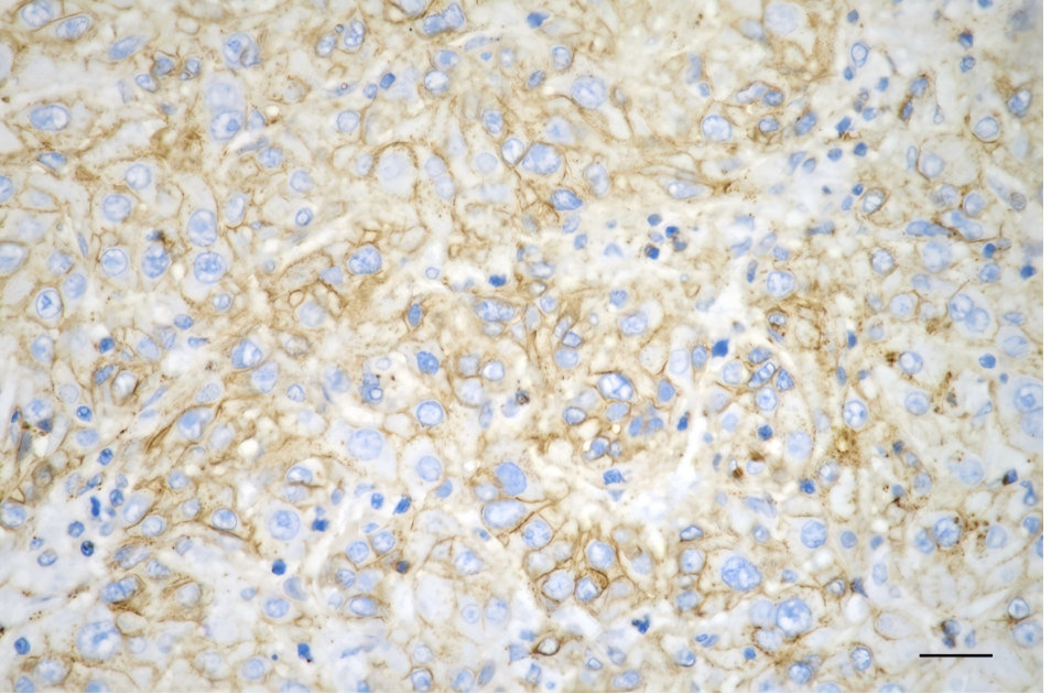 • Immunohistochemistry was performed on paraffin-embedded human hepatocarcinoma using flotillin 1 antibody. Antigen retrieval was done in sodium citrate buffer (pH 6.0). DAB was used for detection, with hematoxylin counterstaining. Images were acquired using a Nikon Ci-L Plus microscope (40× objective). Scale bar: 25 μm.