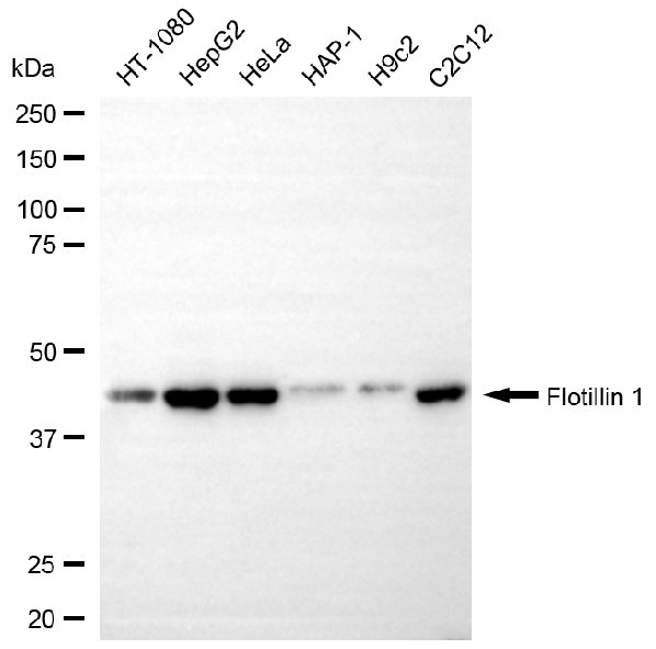• Western blotting analysis using flotillin 1 antibody. Total cell lysates (30 μg for H9c2, 20 μg for others) from various cell lines were loaded and separated by SDS-PAGE. The blot was incubated with flotillin 1 antibody and HRP-conjugated goat anti-rabbit secondary antibody respectively.