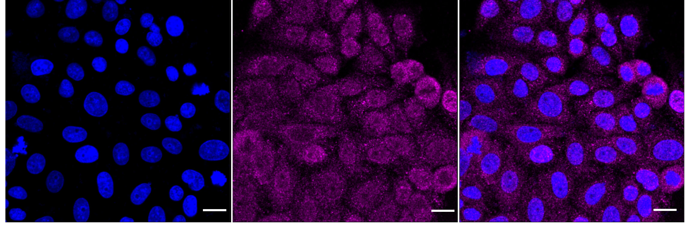 Immunocytochemical staining of HepG2 cells with frizzled class receptor 9 antibody. Nuclei were stained blue with DAPI; Frizzled class receptor 9 was stained magenta with Alexa Fluor? 647. Images were taken using Leica stellaris 5. Protein abundance based on laser Intensity and smart gain: Medium. Scale bar: 20 μm.