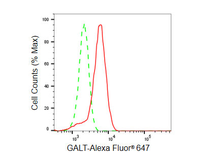 Flow cytometric analysis of GALT expression in HeLa cells using GALT antibody. Green, isotype control; red, GALT.