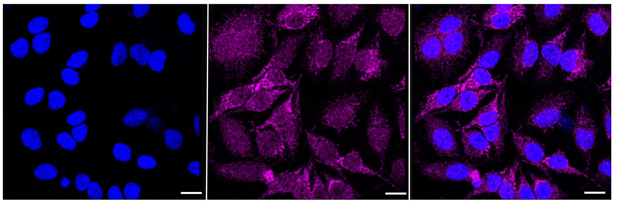 Immunocytochemical staining of Hela cells with GALT antibody. Nuclei were stained blue with DAPI; GALT was stained magenta with Alexa Fluor? 647. Images were taken using Leica stellaris 5. Protein abundance based on laser Intensity and smart gain: Medium. Scale bar: 20 μm.
