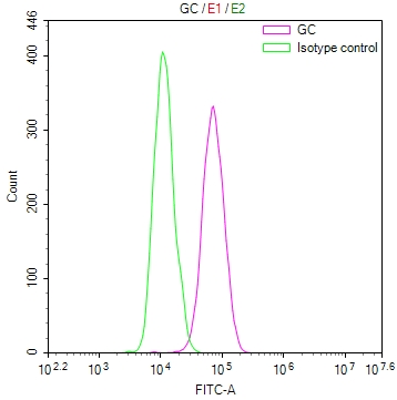 Overlay Peak curve showing HepG2 cells stained with CSB-RA089046A0HU (red line) at 1:100. The cells were fixed in 4% formaldehyde and permeated by 0.2% TritonX-100 for 10min. Then 10% normal goat serum to block non-specific protein-protein interactions followed by the antibody (1ug/1*106cells) for 45min at 4℃. The secondary antibody used was FITC-conjugated goat anti-rabbit IgG (H+L) at 1/200 dilution for 35min at 4℃.Control antibody (green line) was Rabbit IgG (1ug/1*106cells) used under the same conditions. Acquisition of >10,000 events was performed.