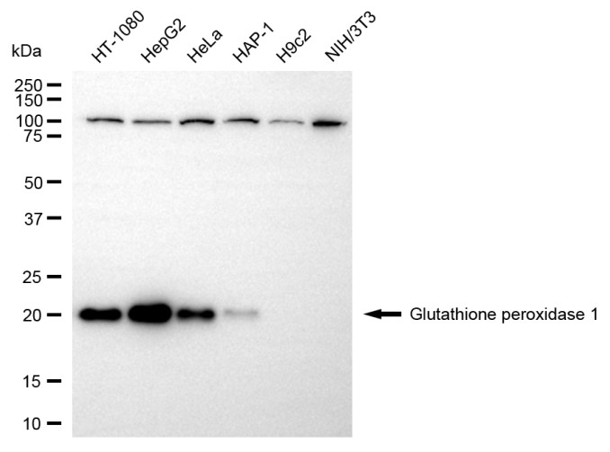 Western blotting analysis using glutathione peroxidase 1 antibody. Total cell lysates (30 μg) from various cell lines were loaded and separated by SDS-PAGE. The blot was incubated with glutathione peroxidase 1 antibody and HRP-conjugated goat anti-rabbit secondary antibody respectively.