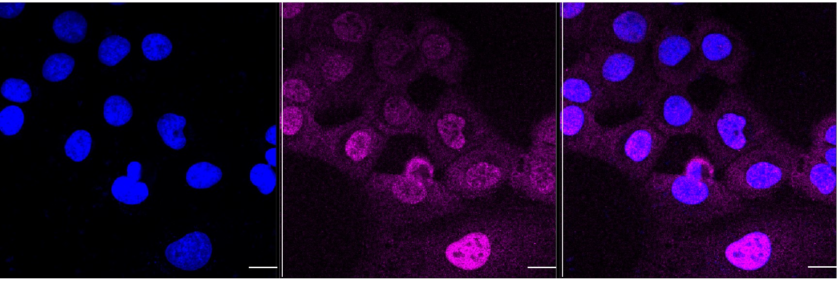 Immunocytochemical staining of HT-1080 cells with Glycogen synthase kinase 3 beta antibody. Nuclei were stained blue with DAPI; Glycogen synthase kinase 3 beta was stained magenta with Alexa Fluor? 647. Images were taken using Leica stellaris 5. Protein abundance based on laser Intensity and smart gain: Medium. Scale bar, 20 μm.