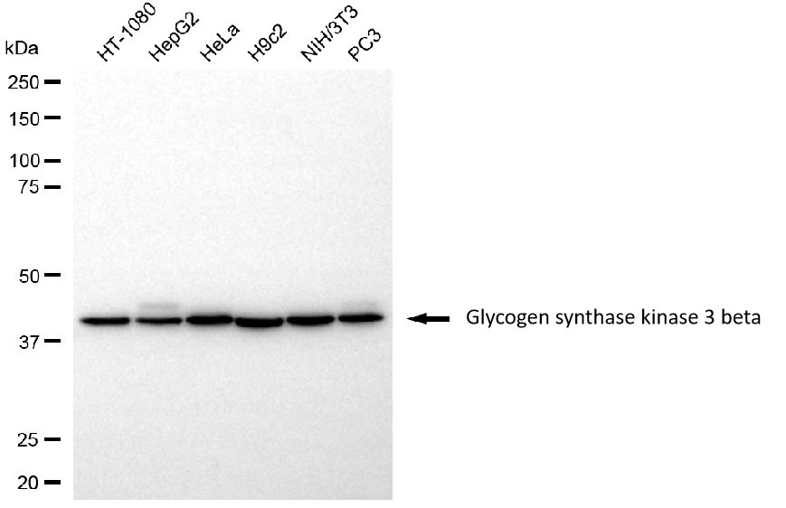 Western blotting analysis using glycogen synthase kinase 3 beta antibody. Total cell lysates (30 μg) from various cell lines were loaded and separated by SDS-PAGE. The blot was incubated with glycogen synthase kinase 3 beta antibody and HRP-conjugated goat anti-rabbit secondary antibody respectively.
