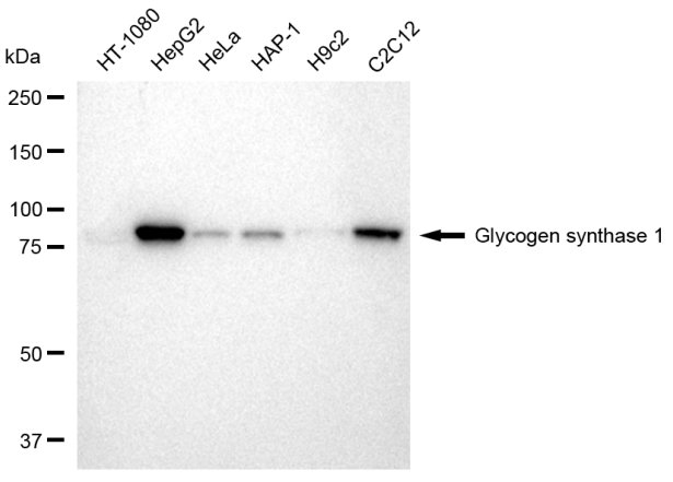 Western blotting analysis using Glycogen synthase 1 antibody. Total cell lysates (30 μg) from various cell lines were loaded and separated by SDS-PAGE. The blot was incubated with Glycogen synthase 1 antibody and HRP-conjugated goat anti-rabbit secondary antibody respectively.