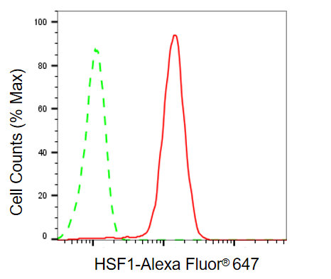 Flow cytometric analysis of HSF1 expression in HepG2 cells using HSF1 antibody. Green, isotype control; red, HSF1.