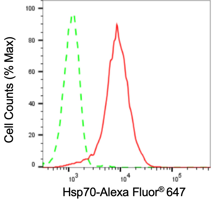 Flow cytometric analysis of Hsp70 expression in HepG2 cells using Hsp70 antibody. Green, isotype control; red, Hsp70.