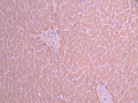 IHC image of CSB-RA957600A0HU diluted at 1:100 and staining in paraffin-embedded human liver tissue performed on a Leica BondTM system. After dewaxing and hydration, antigen retrieval was mediated by high pressure in a citrate buffer (pH 6.0). Section was blocked with 10% normal goat serum 30min at RT. Then primary antibody (1% BSA) was incubated at 4°C overnight. The primary is detected by a Goat anti-rabbit polymer IgG labeled by HRP and visualized using 0.05% DAB.