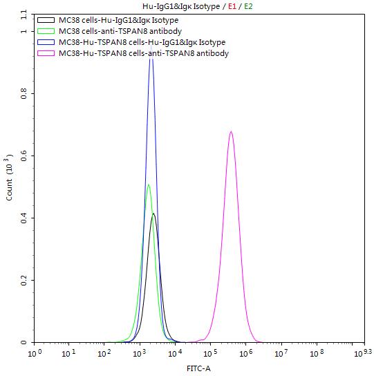 • Untransfected MC38 cells and transfected Human TSPAN8 MC38 stable cells were stained with Human IgG1&Igκ Isotype Control (CSB-RA011156MA1HU) and anti-TSPAN8 antibody (CSB-RA025166MA1HU) (2μg/1*106cells), washed and then followed by FITC-conjugated anti-Human IgG Fc antibody and analyzed with flow cytometry.