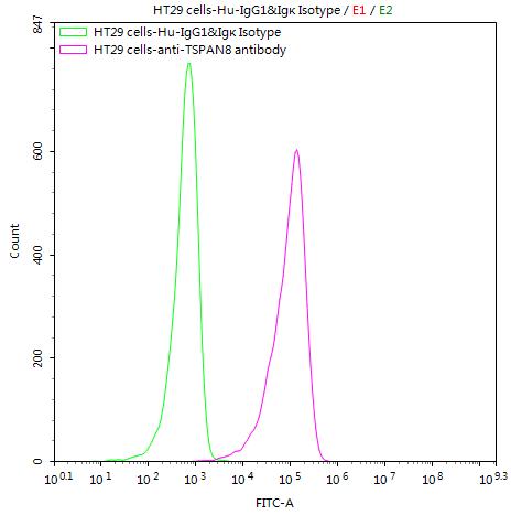 • HT29 cells were stained with Human IgG1&Igκ Isotype Control (CSB-RA011156MA1HU)(green line) and anti-TSPAN8 antibody (CSB-RA882142MA1HU) (2μg/1*106cells) (red line), washed and then followed by FITC-conjugated anti-Human IgG Fc antibody and analyzed with flow cytometry.