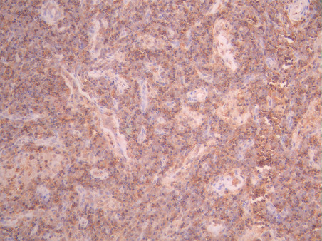 IHC image of CSB-RA097685A0HU diluted at 1:100 and staining in paraffin-embedded human lymph node tissue performed on a Leica BondTM system. After dewaxing and hydration, antigen retrieval was mediated by high pressure in a citrate buffer (pH 6.0). Section was blocked with 10% normal goat serum 30min at RT. Then primary antibody (1% BSA) was incubated at 4°C overnight. The primary is detected by a Goat anti-rabbit polymer IgG labeled by HRP and visualized using 0.05% DAB.