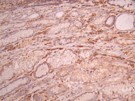 IHC image of CSB-RA097685A0HU diluted at 1:100 and staining in paraffin-embedded human gastric cancer performed on a Leica BondTM system. After dewaxing and hydration, antigen retrieval was mediated by high pressure in a citrate buffer (pH 6.0). Section was blocked with 10% normal goat serum 30min at RT. Then primary antibody (1% BSA) was incubated at 4°C overnight. The primary is detected by a Goat anti-rabbit polymer IgG labeled by HRP and visualized using 0.05% DAB.