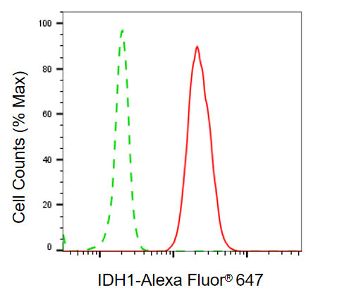 • Flow cytometric analysis of IDH1 expression in C2C12 cells using IDH1 antibody. Green, isotype control; red, IDH1.