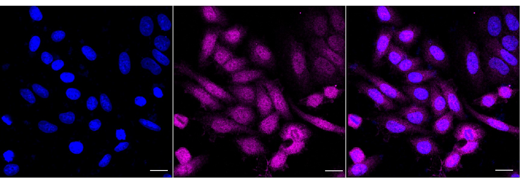 • Immunocytochemical staining of HepG2 cells with IDH1 antibody. Nuclei were stained blue with DAPI; IDH1 was stained magenta with Alexa Fluor? 647. Images were taken using Leica stellaris 5. Protein abundance based on laser Intensity and smart gain: Medium. Scale bar, 20 μm.