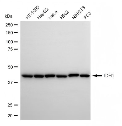 • Western blotting analysis using IDH1 antibody. Total cell lysates (30 μg) from various cell lines were loaded and separated by SDS-PAGE. The blot was incubated with IDH1 antibody and HRP-conjugated goat anti-rabbit secondary antibody respectively.