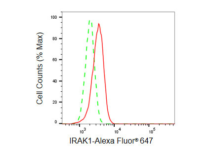 • Flow cytometric analysis of IRAK1 expression in HepG2 cells using IRAK1 antibody. Green, isotype control; red, IRAK1.