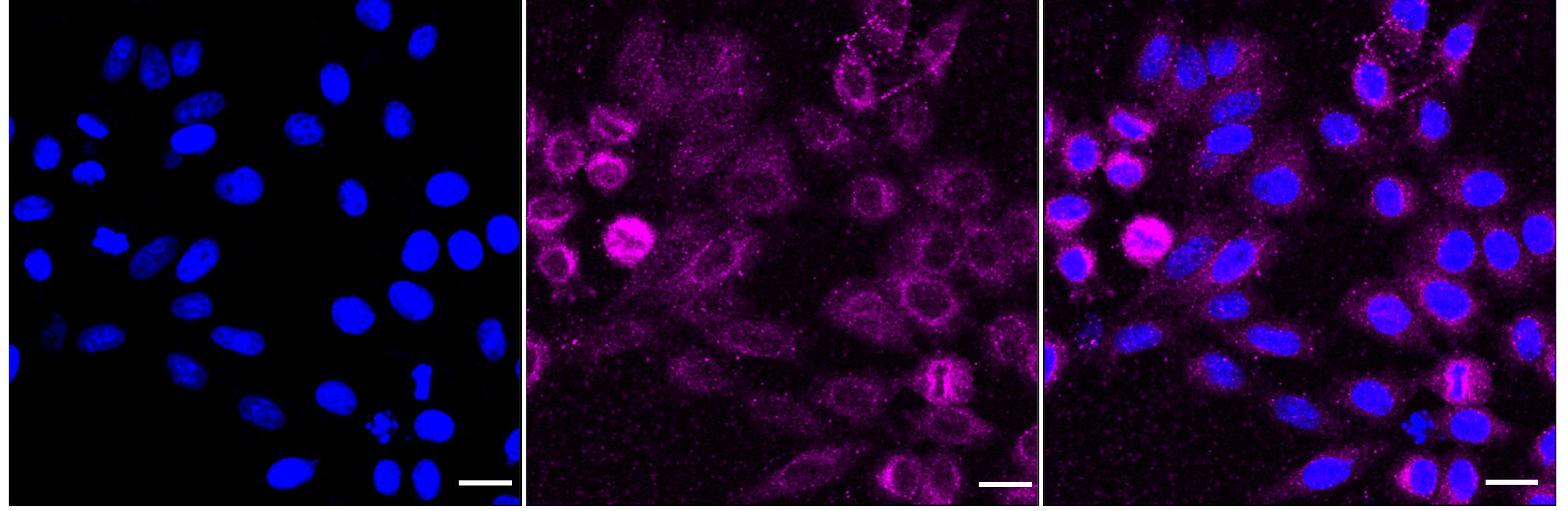 • Immunocytochemical staining of HepG2 cells with IRAK1 antibody. Nuclei were stained blue with DAPI; IRAK1 was stained magenta with Alexa Fluor? 647. Images were taken using Leica stellaris 5. Protein abundance based on laser Intensity and smart gain: Medium. Scale bar: 20 μm.