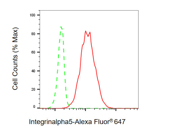 • Flow cytometric analysis of Integrin alpha 5 expression in C2C12 cells using Integrin alpha 5 antibody. Green, isotype control; red, Integrin alpha 5.