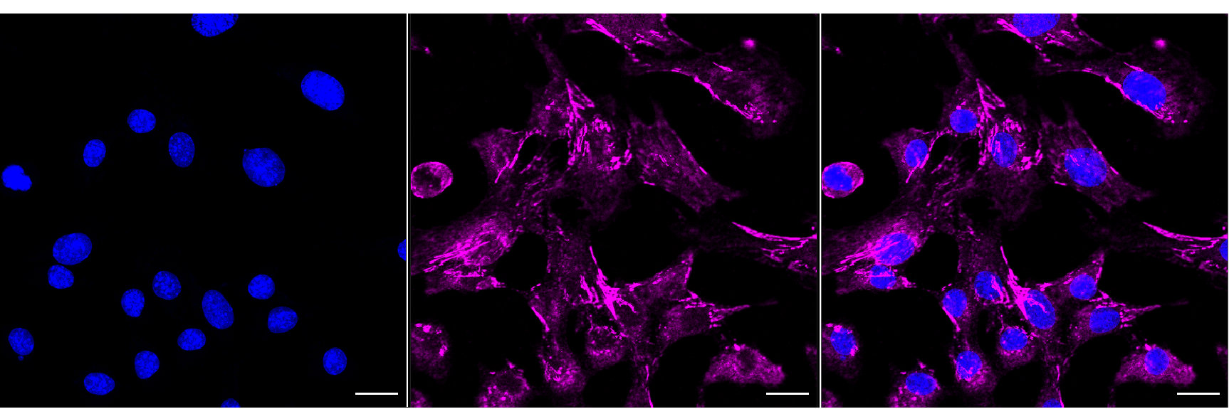• Immunocytochemical staining of C2C12 cells with Integrin alpha 5 antibody. Nuclei were stained blue with DAPI; Integrin alpha 5 was stained magenta with Alexa Fluor? 647. Images were taken using Leica stellaris 5. Protein abundance based on laser Intensity and smart gain: Medium. Scale bar, 20 μm.