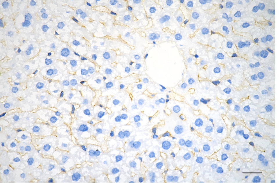 • Immunohistochemistry was performed on paraffin-embedded mouse liver using integrin alpha 5 antibody. Antigen retrieval was done in sodium citrate buffer (pH 6.0). DAB was used for detection, with hematoxylin counterstaining. Images were acquired using a Nikon Ci-L Plus microscope (40× objective). Scale bar: 25 μm.