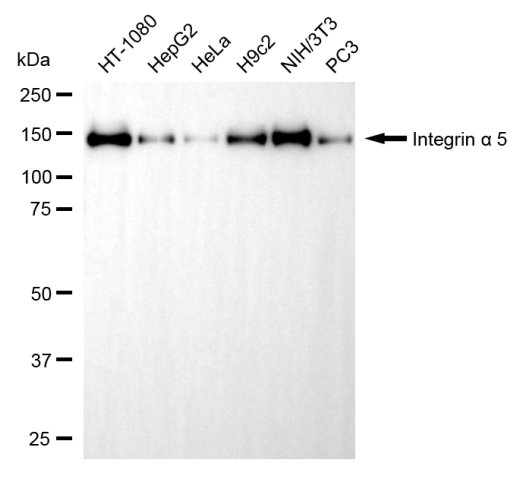 • Western blotting analysis using integrin alpha 5 antibody. Total cell lysates (30 μg) from various cell lines were loaded and separated by SDS-PAGE. The blot was incubated with integrin alpha 5 antibody and HRP-conjugated goat anti-rabbit secondary antibody respectively.