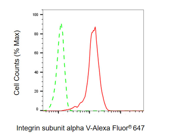 • Flow cytometric analysis of Integrin subunit alpha V expression in HepG2 cells using Integrin subunit alpha V antibody. Green, isotype control; red, Integrin subunit alpha V.