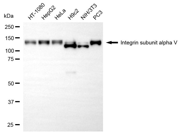 • Western blotting analysis using integrin subunit alpha V antibody. Total cell lysates (30 μg) from various cell lines were loaded and separated by SDS-PAGE. The blot was incubated with integrin subunit alpha V antibody and HRP-conjugated goat anti-rabbit secondary antibody respectively.