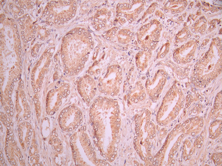 • IHC image of CSB-RA151954A0HU diluted at 1:100 and staining in paraffin-embedded human prostate cancer performed on a Leica BondTM system. After dewaxing and hydration, antigen retrieval was mediated by high pressure in a citrate buffer (pH 6.0). Section was blocked with 10% normal goat serum 30min at RT. Then primary antibody (1% BSA) was incubated at 4°C overnight. The primary is detected by a Goat anti-rabbit polymer IgG labeled by HRP and visualized using 0.05% DAB.