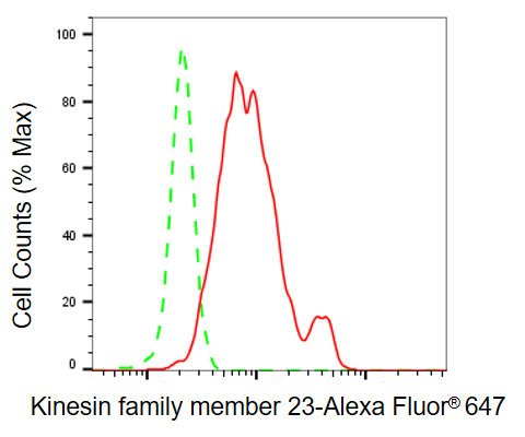 Flow cytometric analysis of kinesin family member 23 expression in HepG2 cells using kinesin family member 23 antibody. Green, isotype control; red, kinesin family member 23.