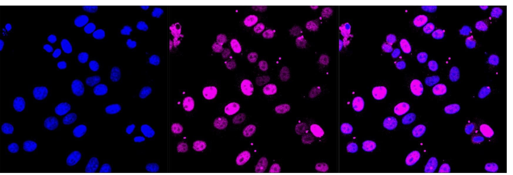 Immunocytochemical staining of HepG2 cells with Kinesin family member 23 antibody. Nuclei were stained blue with DAPI; Kinesin family member 23 was stained magenta with Alexa Fluor? 647. Images were taken using Leica stellaris 5. Protein abundance based on laser Intensity and smart gain: High. Scale bar, 20 μm.