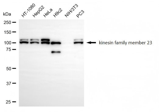 Western blotting analysis using kinesin family member 23 antibody. Total cell lysates (30 μg) from various cell lines were loaded and separated by SDS-PAGE. The blot was incubated with kinesin family member 23 antibody and HRP-conjugated goat anti-rabbit secondary antibody respectively.