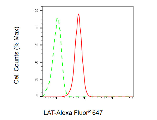 Flow cytometric analysis of LAT expression in HT-1080 cells using LAT antibody. Green, isotype control; red, LAT.