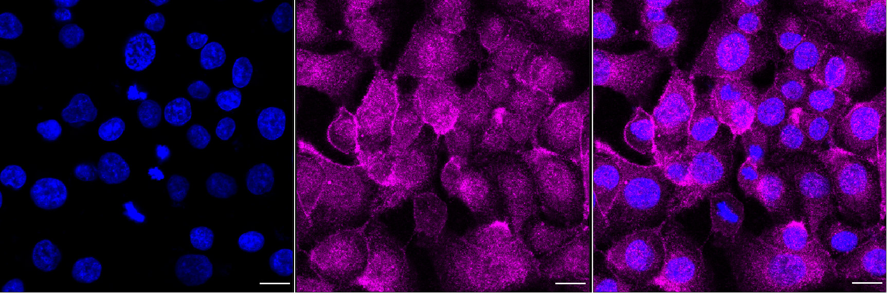Immunocytochemical staining of HT-1080 cells with LAT antibody. Nuclei were stained blue with DAPI; LAT was stained magenta with Alexa Fluor? 647. Images were taken using Leica stellaris 5. Protein abundance based on laser Intensity and smart gain: Medium. Scale bar, 20 μm.